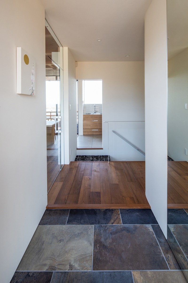 複数の区画はそれぞれ地盤の高さが異なり、最も高いエリアから海側の低いエリアまでおよそ1.4mの段差が生じる。そこでゲストユニットとオーナーの部屋をBM+900に設定し、ガラス張りのギャラリーを介してLDKへとつなげた。またLDKの一部をBM+500に跨らせることで下部を空洞とし、門から正面を見通した際に建物越しに漁村と海を望めるよう工夫している。さらにLDKから1600ミリ下がった位置に浴室と洗面を配置し、全開放できる開口を設けることで瀬戸内海を一望できる構成とした。
